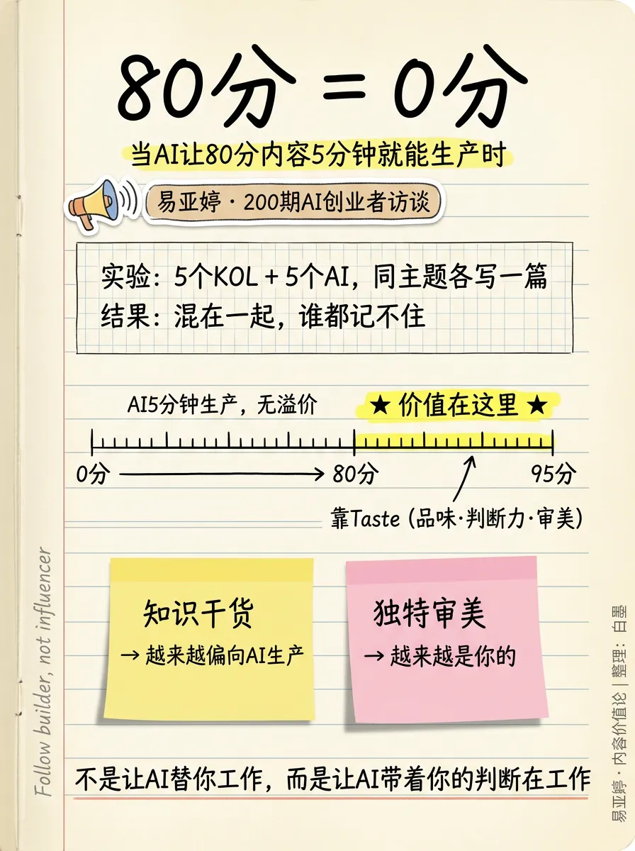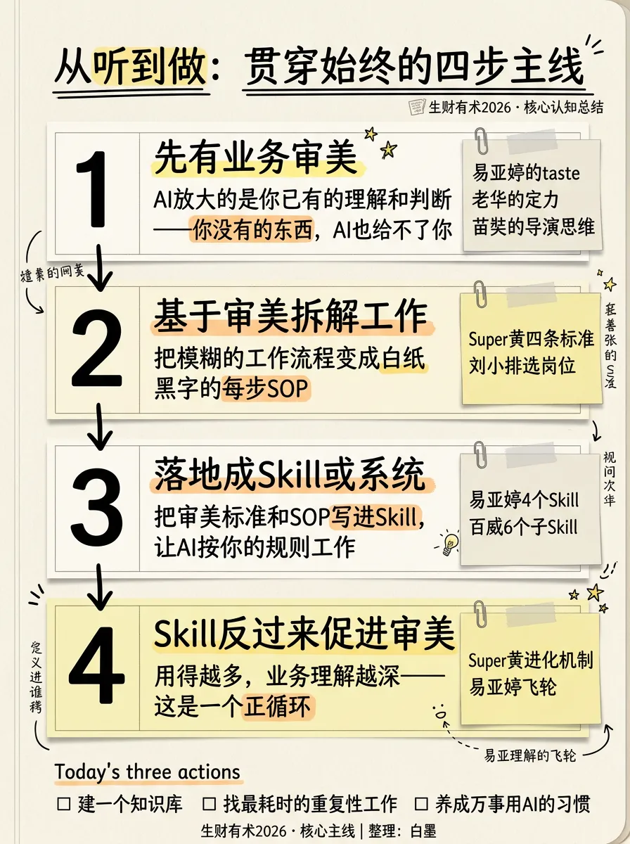 第一步,先有业务审美。 你对自己业务的理解——什么是好的内容、什么是好的服务、什么是好的产品——这是一切的起点。易亚婷说80到95分靠taste。富贵说内容的起点是用户情绪不是产品功能。苗奘说导演技能被替代了但导演思维没有。老华说壁垒不在产品在组织。可拉说AI犯错不是因为笨,是因为没有你的信息。