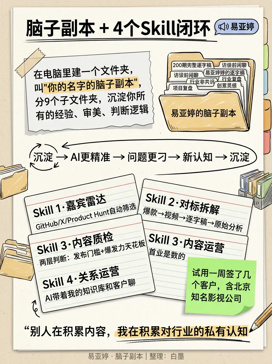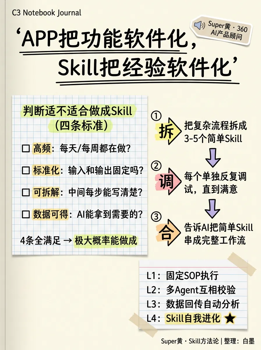第四步,Skill反过来促进你的审美。 Super黄的进化机制——每周数据回传,Skill自动分析什么有效什么无效。易亚婷的飞轮——每期新认知沉淀回脑子副本,下一期AI的输出更精准。焦波的”数据有复利”——积累越多,AI帮你越好。