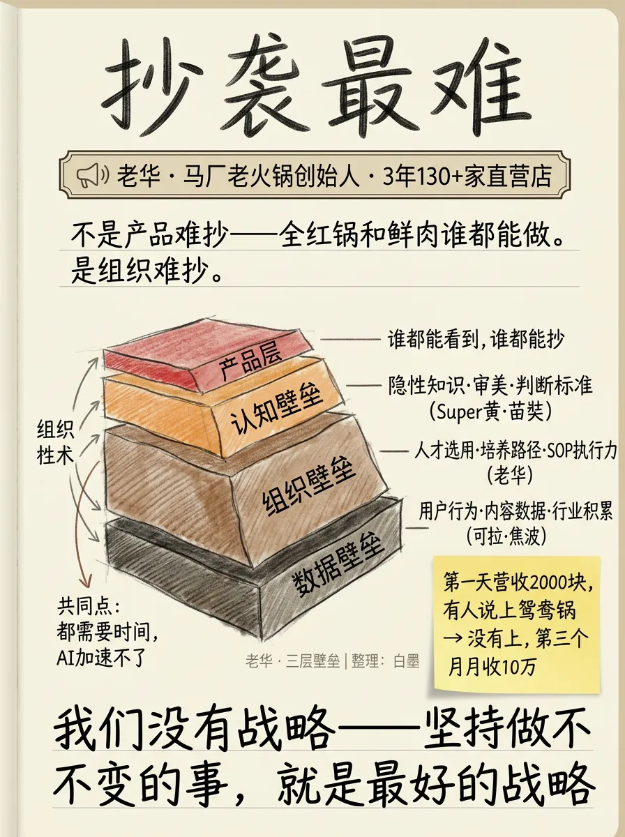 核心定位要不要定死? 老华说”如果因为生意不好第二天就上鸳鸯锅,这个事情从根源就错了”。你的核心价值主张是什么?这个主张即使短期数据不好看,要不要坚持?这是一个需要管理层拍板的战略问题。