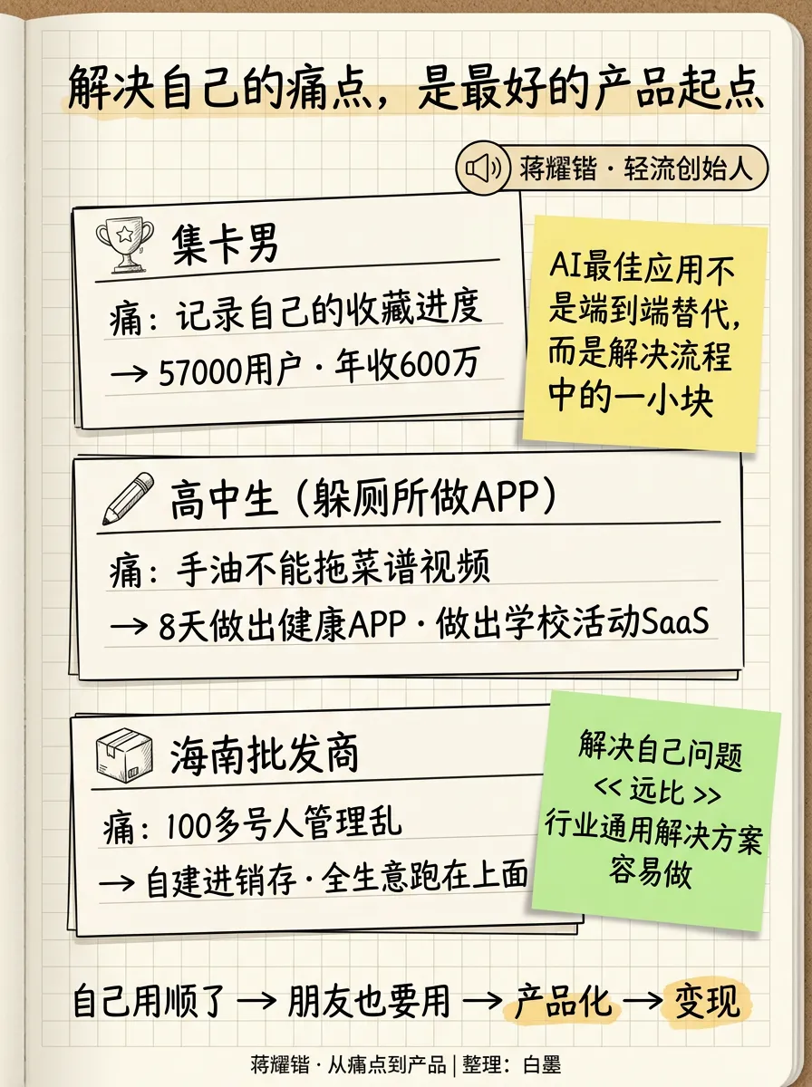 第一,都从自己的痛点开始。 周知是自己做视频太慢,集卡男是自己想记录收藏,批发商是自己仓库管理太乱,孟虎是客户现场提了需求——没有一个人是坐在办公室里”规划”出来的。