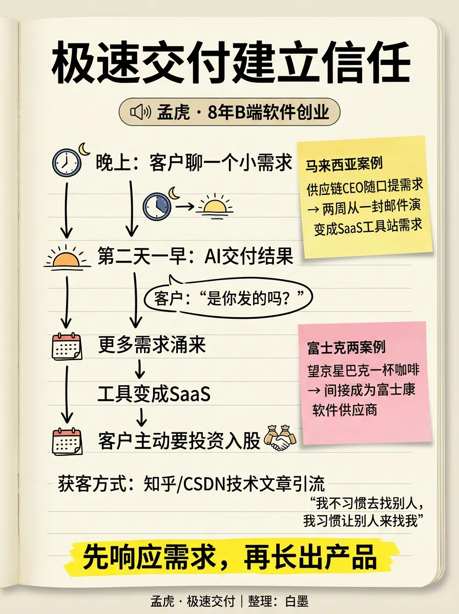 两个案例的核心逻辑完全一样:客户提了一个小需求→你用AI极速交付→超出预期→更多需求涌来→从工具变成SaaS→客户彻底绑定。