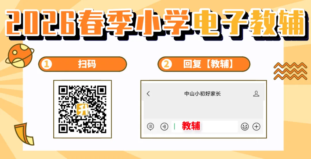 长按扫描上方二维码,关注并进入公众号【中山小初好家长】,回复关键词【电子教辅】获取免费电子教辅下载链接,即可快速获取!
