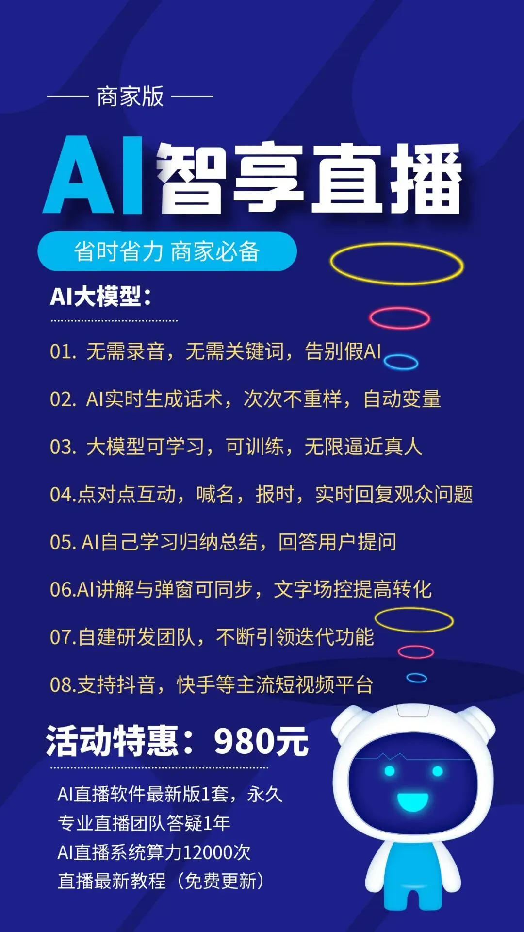 • 版本区分:标准版(980元,ai无人直播);数字人版(2980元,支持虚拟形象出镜)。