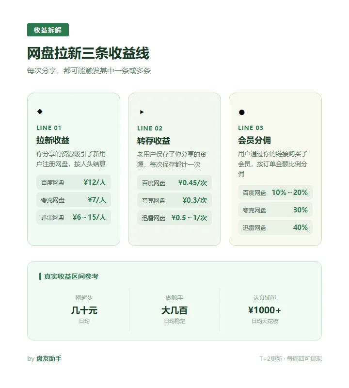 ① 帮平台带来新用户,这个叫「拉新」,百度网盘付¥12/人,夸克网盘付¥7/人,迅雷网盘付¥6~15/人