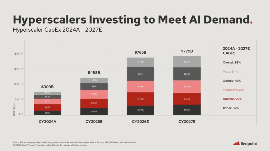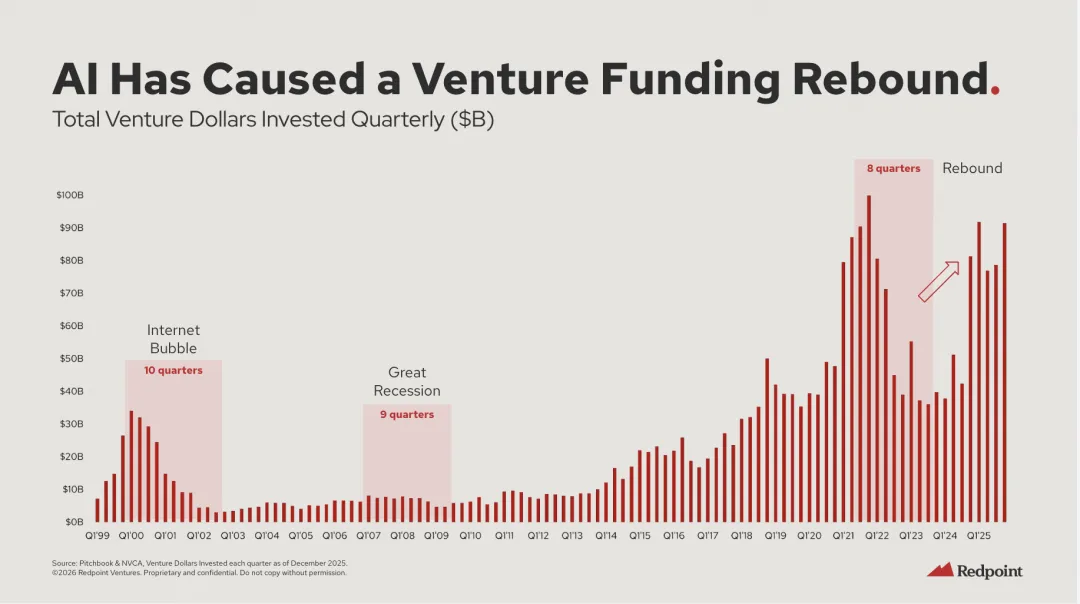 2022 年 11 月 ChatGPT 的发布,拉开了新一轮人工智能技术革命的序幕。时隔四年,AI 早已从实验室的技术概念,演变为重塑全球科技产业底层逻辑的核心力量。红点创投(Redpoint Ventures)发布的 2026 年市场更新报告,以详实的产业数据与深度的行业洞察,勾勒出这场技术革命的一体两面:一边是 AI 基础设施建设的爆发式增长,以真实需求为锚的产业浪潮正滚滚向前;另一边是传统软件行业(SaaS)遭遇的估值崩塌与生存危机,延续十余年的行业范式正在 AI 的冲击下加速瓦解。这场变革不仅重构了软件行业的商业逻辑,更重塑了全球科技领域的投资规则与企业生存法则。