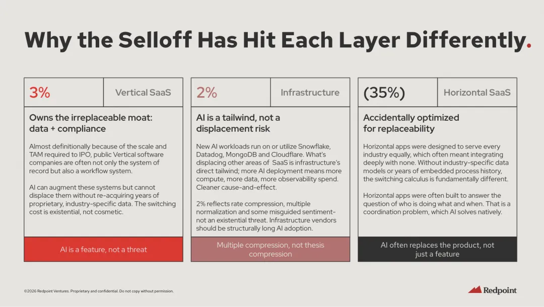 这场估值崩塌并非全行业的无差别冲击,而是呈现出极致的结构性分化。报告数据显示,近一年来,垂直 SaaS 板块累计涨幅达 3%,基础设施软件板块涨幅 2%,而通用型 SaaS 板块跌幅高达 35%。分化的底层逻辑,在于 AI 对不同类型软件企业护城河的冲击程度截然不同。