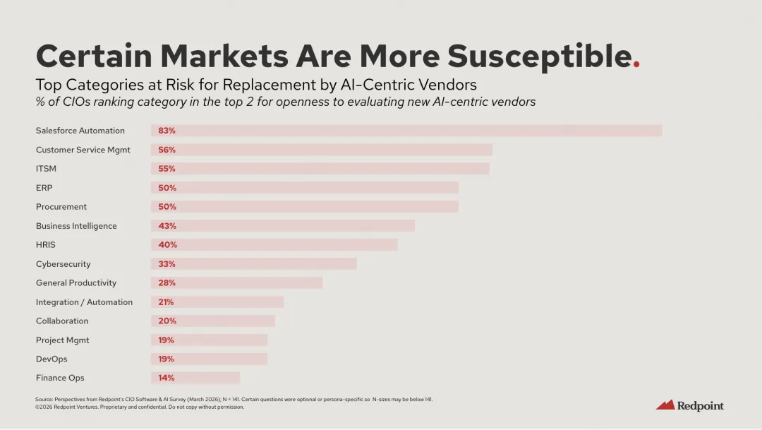 需求端与留存端的双重挤压,进一步加剧了行业的困境。红点创投的 CIO 调研显示,54% 的企业 CIO 正在推进软件供应商整合,45% 的 AI 预算直接替代了原有的软件采购预算,仅有 3% 的 CIO 认为 AI 会带来软件供应商数量的增加。客户服务管理、财务运营、项目管理等通用型 SaaS 品类,已有超 20% 的 CIO 在过去一年认真考虑替换现有供应商。与此同时,延续十余年的按席位定价模式正在瓦解,超 46% 的 CIO 认为,未来按使用量、按业务结果付费的模式将成为主流,传统 SaaS 的收入模型根基正在被动摇。
