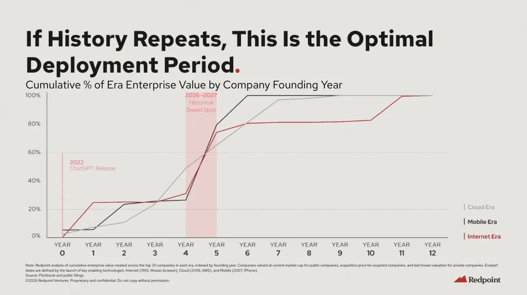 报告同时提醒,当下的 AI 投资难度已达到历史高位。融资轮次的间隔持续缩短,大额融资往往在数日内便完成交割,人才争夺日趋激烈;几乎所有 AI 细分赛道都已出现数十家初创企业与行业巨头同台竞争,技术本身不再是核心壁垒,商业化执行与市场拓展能力成为企业胜出的关键;早期项目的估值门槛持续抬升,对企业的增长速度提出了极致的要求。而历史规律显示,互联网、云计算、移动互联网三轮技术变革中,行业长期的赢家大多诞生于核心技术发布后的第 4-5 年。ChatGPT 发布于 2022 年 11 月,2026-2027 年正是布局长期优质标的的黄金窗口期,这也是当下一级市场投资热潮的核心底层逻辑。
