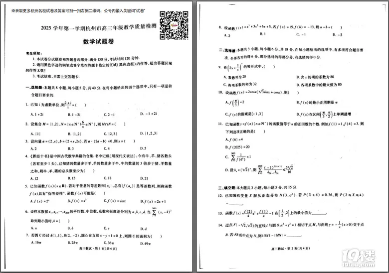 今天为大家准备的是家长上传的2025年杭州市高三数学一模卷,获取试卷完整电子版pdf免费下载及参考答案分析请点击文中的小程序!