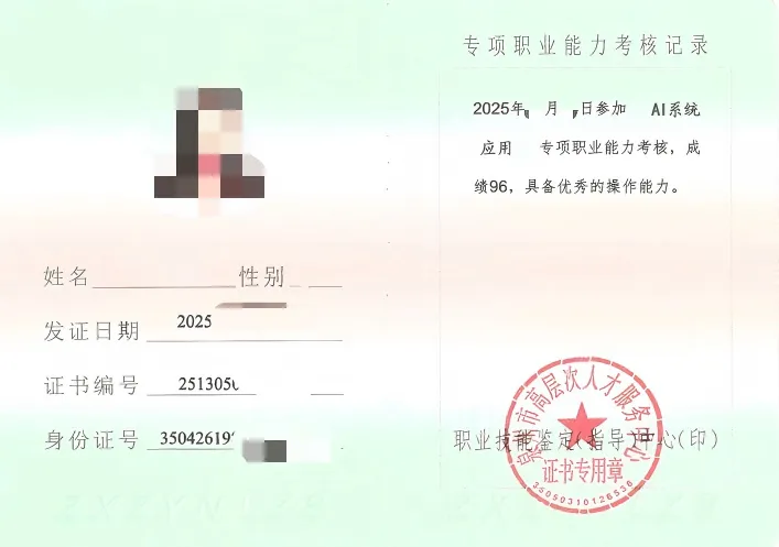 国家认证证书:学员培训期满,考核合格,由泉州市高层次人才服务中心颁发AI系统应用专项职业技能证书。