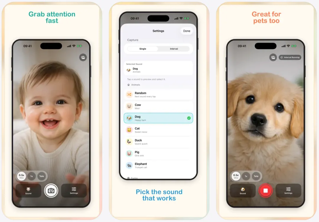 简介:一款音效吸引拍照相机。适合拍摄婴儿、幼儿和小童的照片:只需轻点一下,即可播放趣味音效,迅速吸引宝宝注意力,随即快速拍照