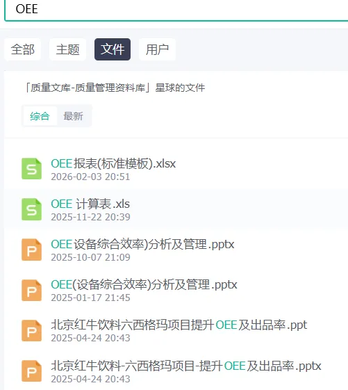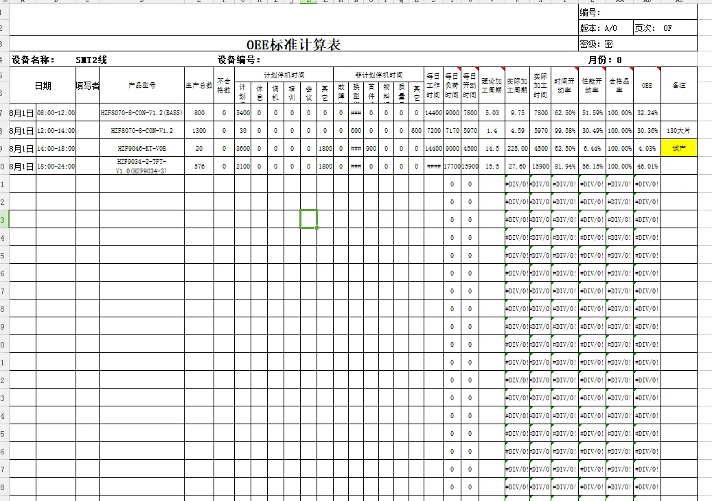设备综合效率OEE统计表(使用)—Excel编辑档 质量文库:质量人的资料库 设备综合效率OEE统计表(使用) OEE标准计算表 OEE标准计算表 日期 1 2 3 4 5 6 产品型号 生产总数 869 912 不合格数 16 23 计划停机时间 计划保养 0 30 休息 20 0 培训 0 0 会议 0 0 其他 0 0 非计划停机时间 故障停机 15 0 换型调试 10 0 首件确认 3 10 物料短缺 0 0 质量异常 0 0 其他 0 7 每日工作时间 480 480 每日负荷时间 460 450 每日开动时间 432 433 理论加工周期 0.3 0.4 实际加工周期 0.9 0.5 实际加工时间 782.1 456 时间开动率 93.91% 96.22% 性能开动率 60.35% 84.25% 合格品率 98.16% 97.48% OEE 55.63% 79.02% 质量文库:共享资料领取 发送【质量培训】领取50个培训PPT; 发送【质量书籍】领取书籍资料包; 发送【质量报表】领取28份模板; 发送【防错管理】领取培训资料包; 发送【分层审核】领取管理资料包; 发送【自助获取】领取更多学习资料; 滑动下方页面,可查看以往资料目录 【质量管理、质量体系】 【8D、VDA、TQM、CQI】 【精益管理、六西格玛、质量改善、QCC】 【质量工具、PDCA、QFD】 【5WHY】【5W2H】【5M1E】 【FMEA】【MSA】【SPC】【PPAP】 【QC七大手法】 【APQP】【项目管理】 点下方阅读原文,下载海量学习资料!