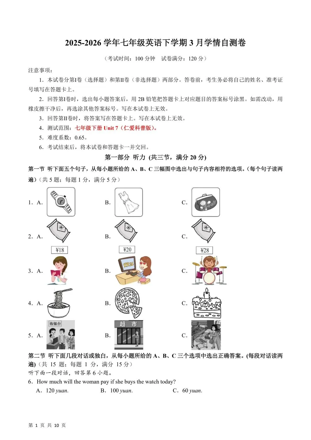 26年春七年级初一下学期英语下学期仁爱版英语第一次月考 测试卷【附答案解析】丨高清电子版可打印(330)