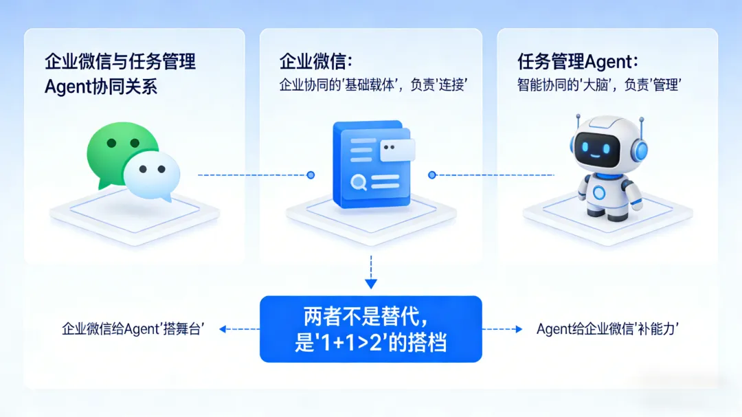 很多人会问:任务管理Agent和企业微信,到底是“互补”还是“替代”?两者结合为什么能颠覆传统协同模式?今天就用通俗的分点,把两者的关系讲透,帮你搞懂如何用它们提升团队效率。