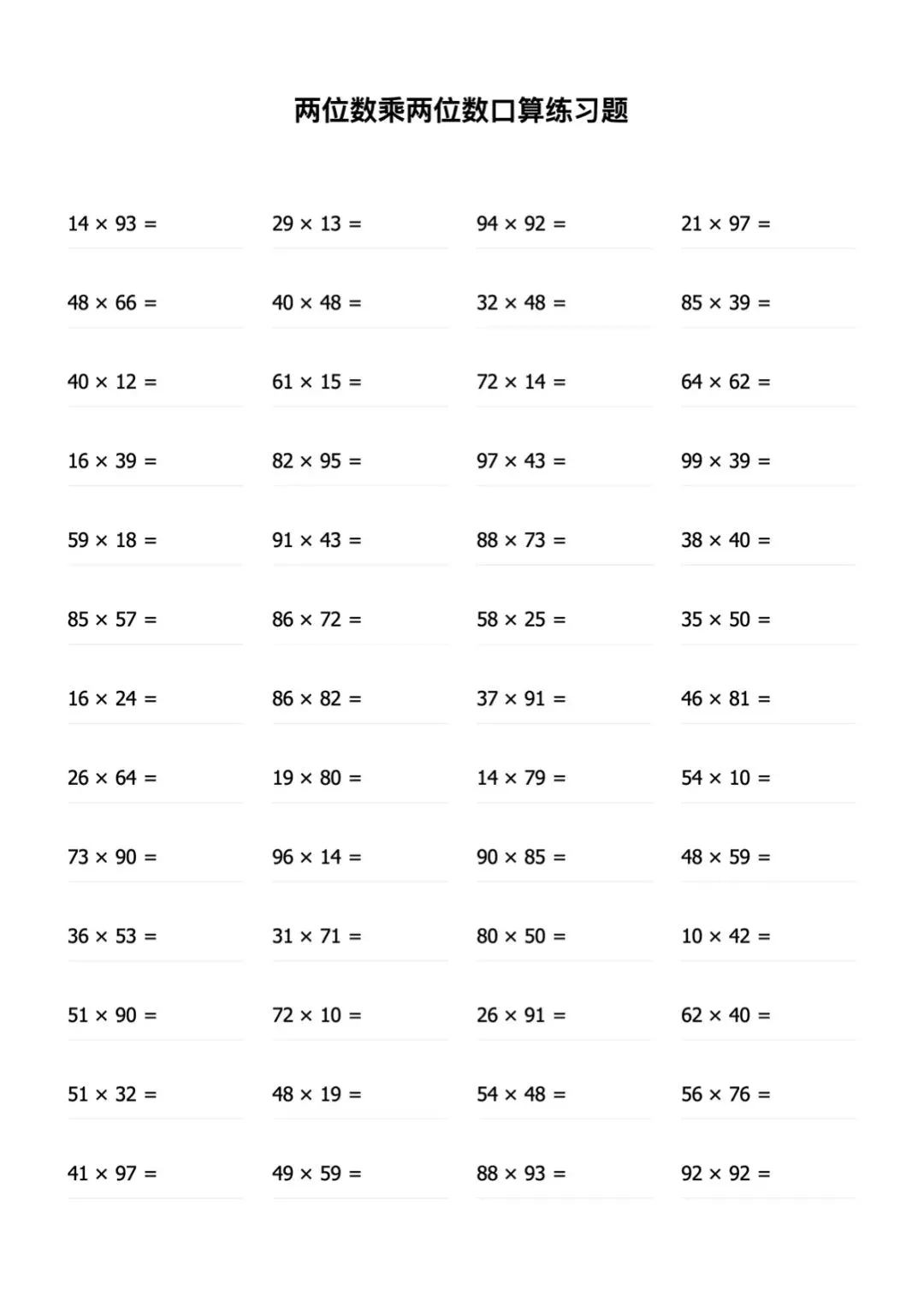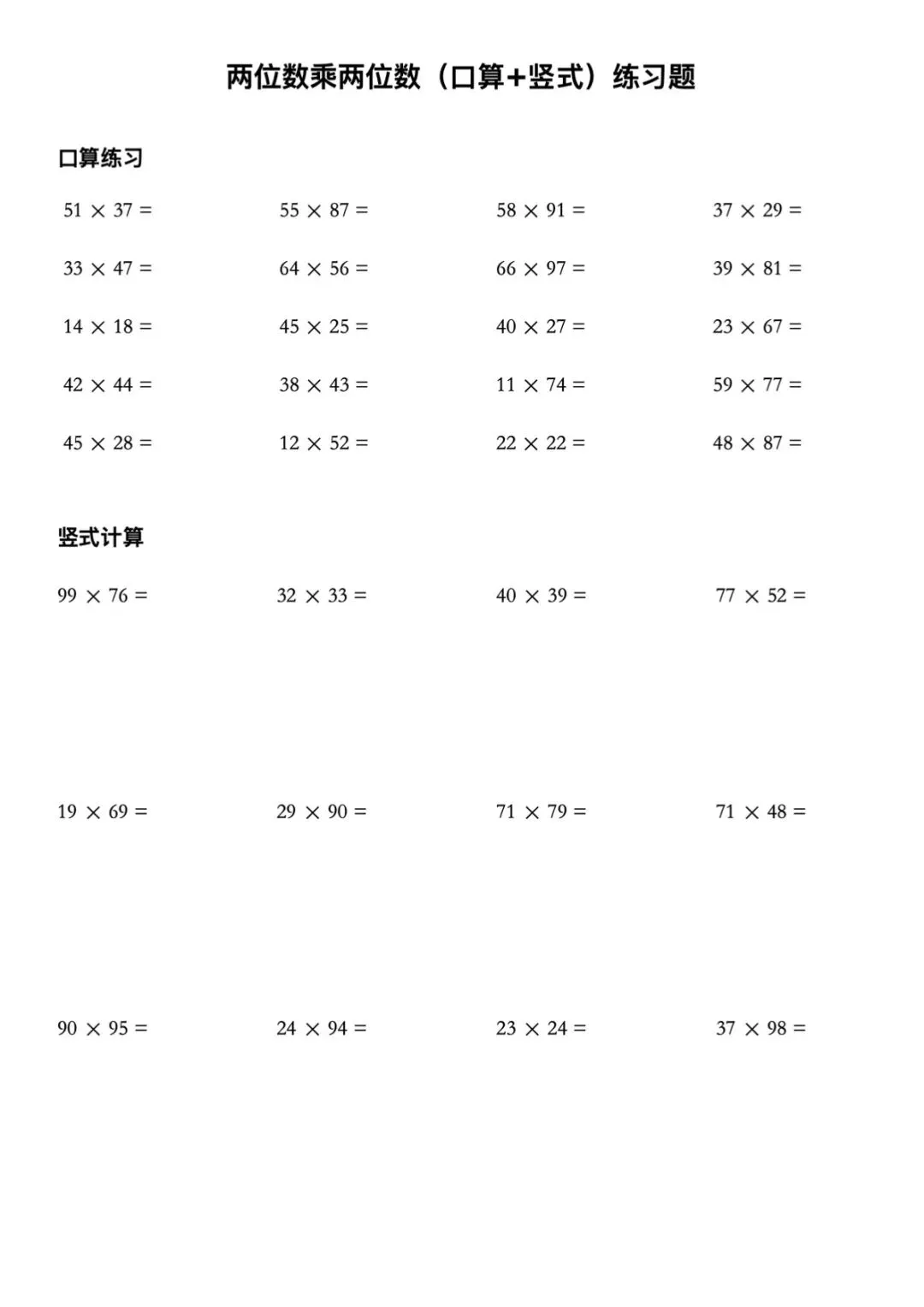 两位数乘两位数专项训练(竖式计算+口算)电子版可打印带答案