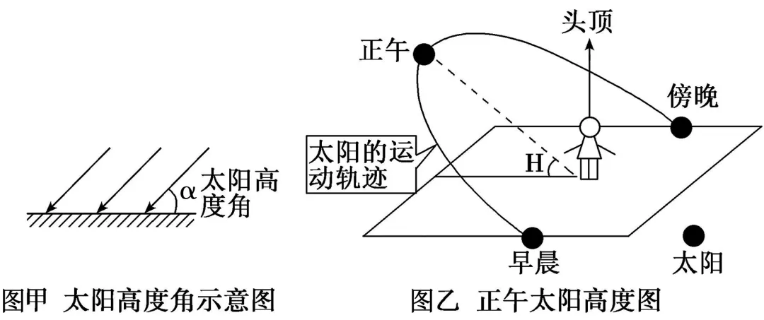 (2)正午太阳高度:一天中太阳高度最大值出现在正午,称为正午太阳高度(如图乙所示)。