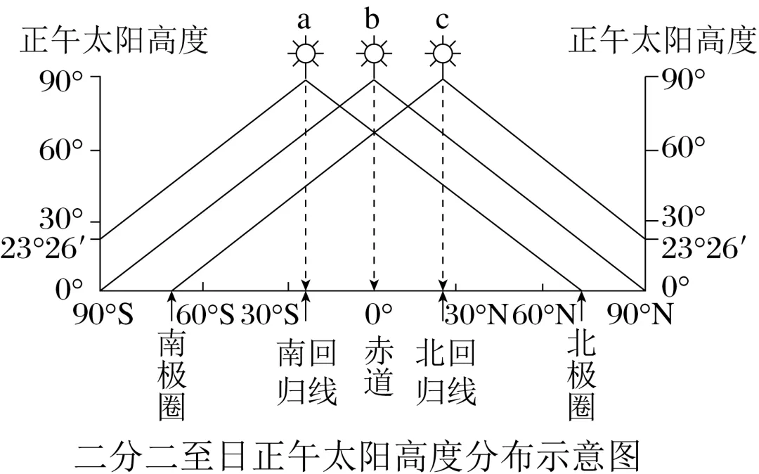(3)春、秋分日:正午太阳高度由赤道向南北两侧递减。如图中b折线所示。
