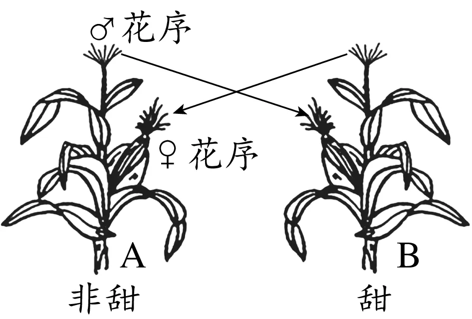 【情境应用】 玉米的花是单性花,雄花内只有雄蕊,着生于植株顶端;雌花内只有雌蕊,着生于叶腋。甜玉米和非甜玉米是一对相对性状,由一对等位基因控制。为了验证基因的分离定律,甲、乙两组同学都将纯合的非甜玉米和甜玉米间行种植,分别挂牌,试图按孟德尔的实验原理进行操作,以验证F2分离比。两组实验的亲本均按如图所示进行人工杂交(箭头表示人工传粉)。