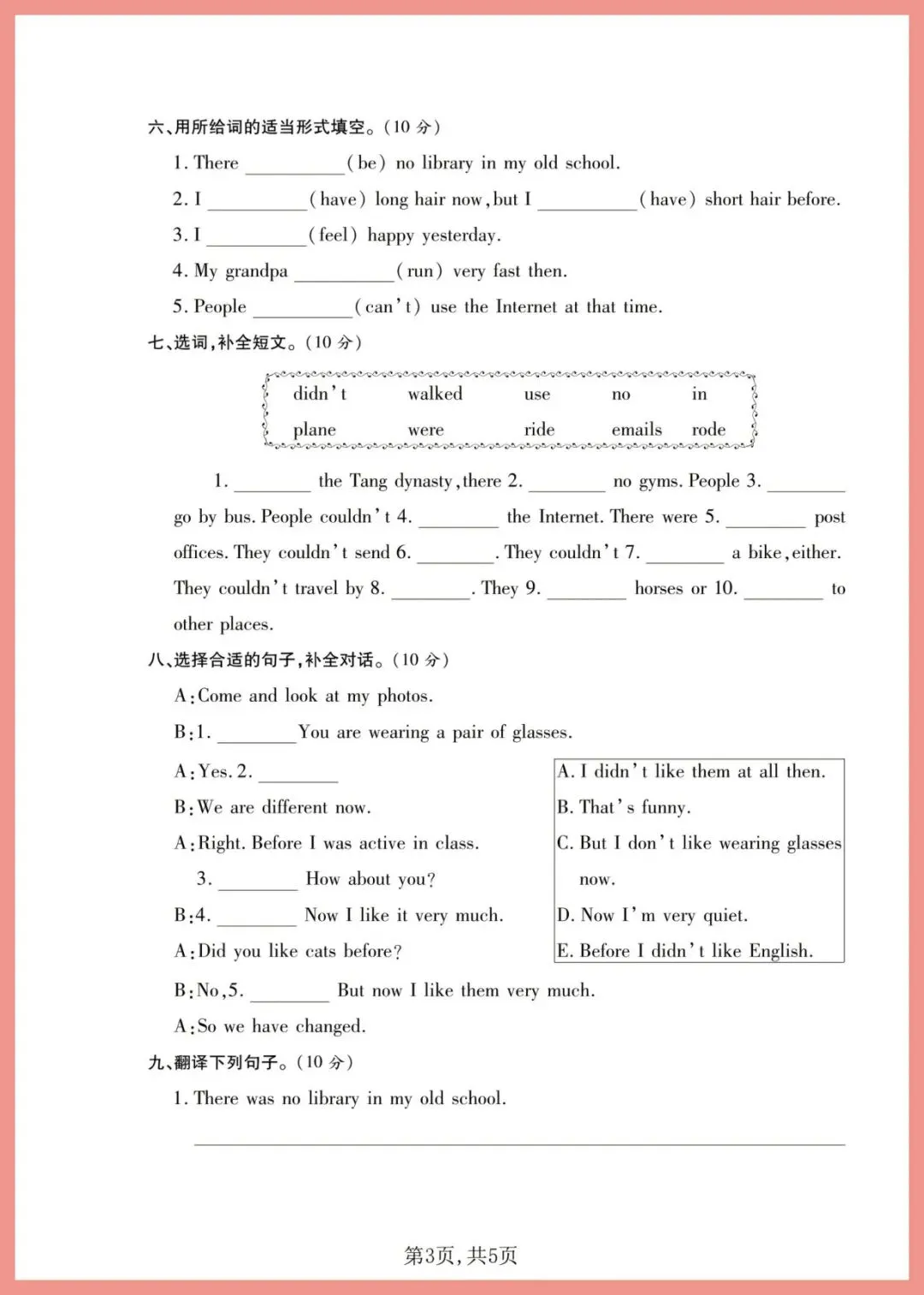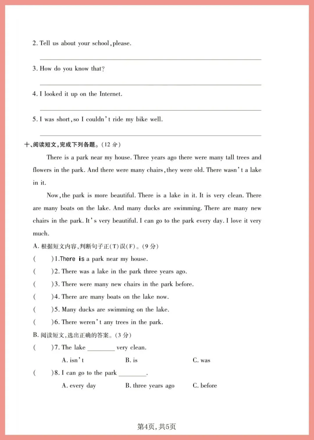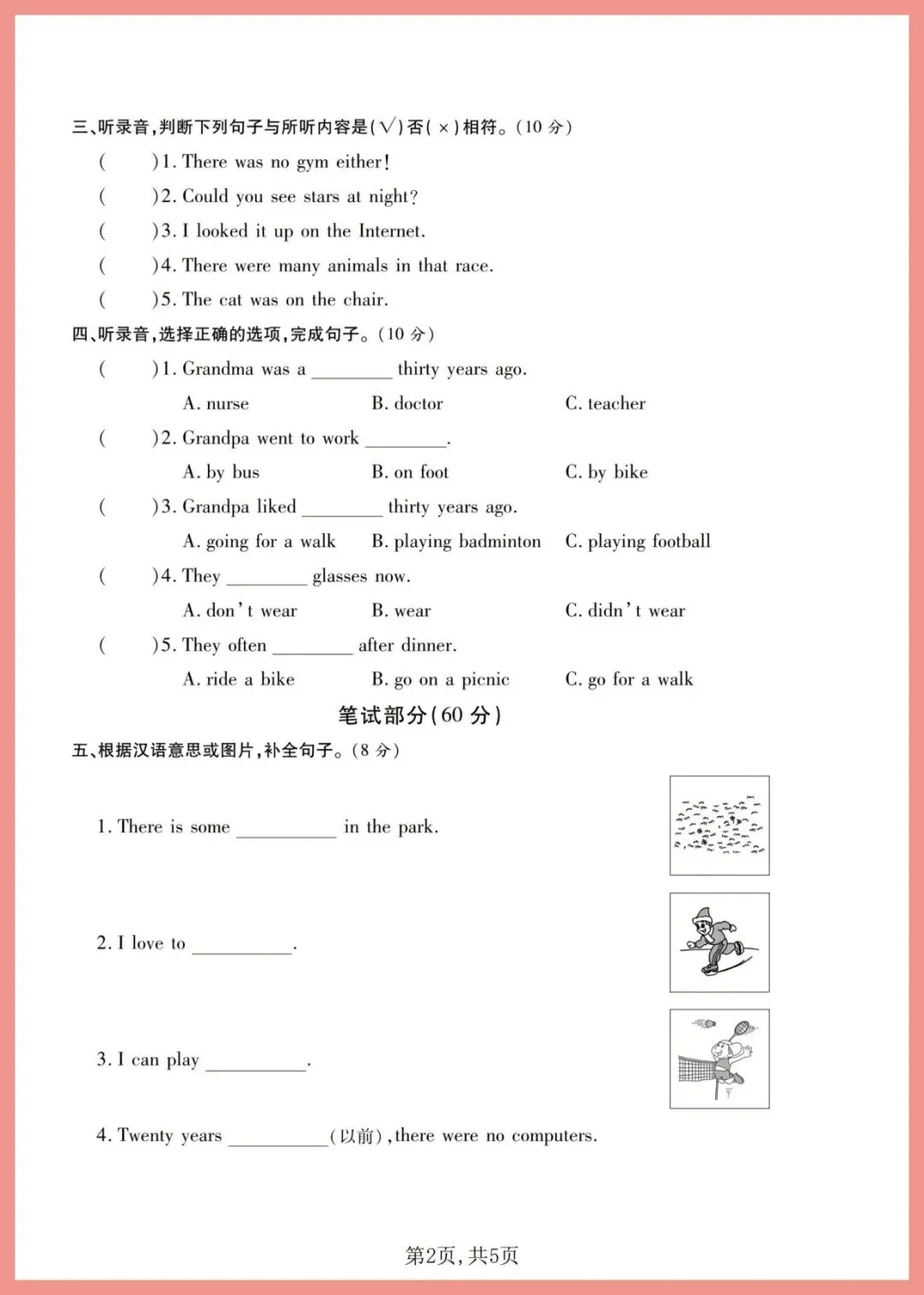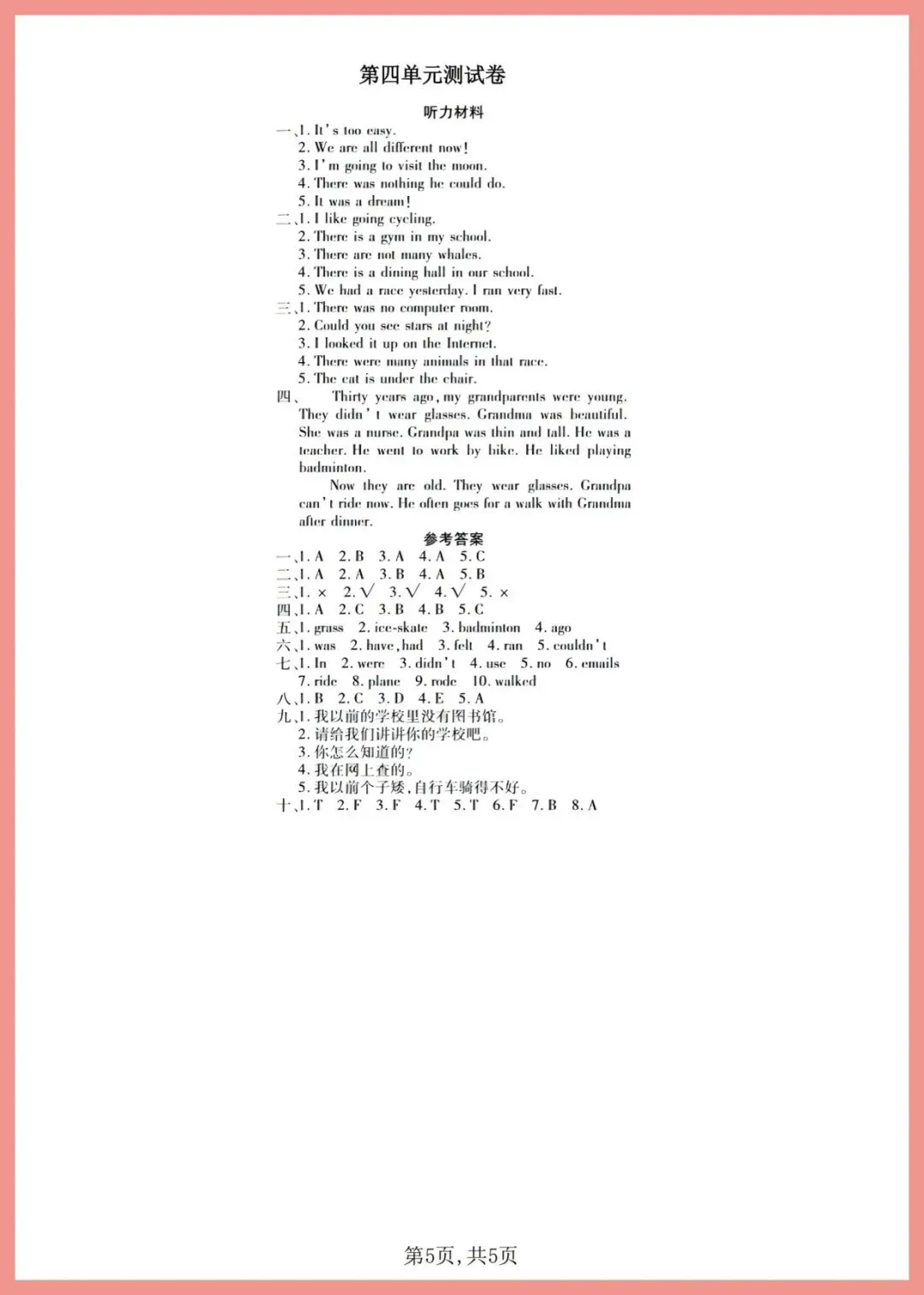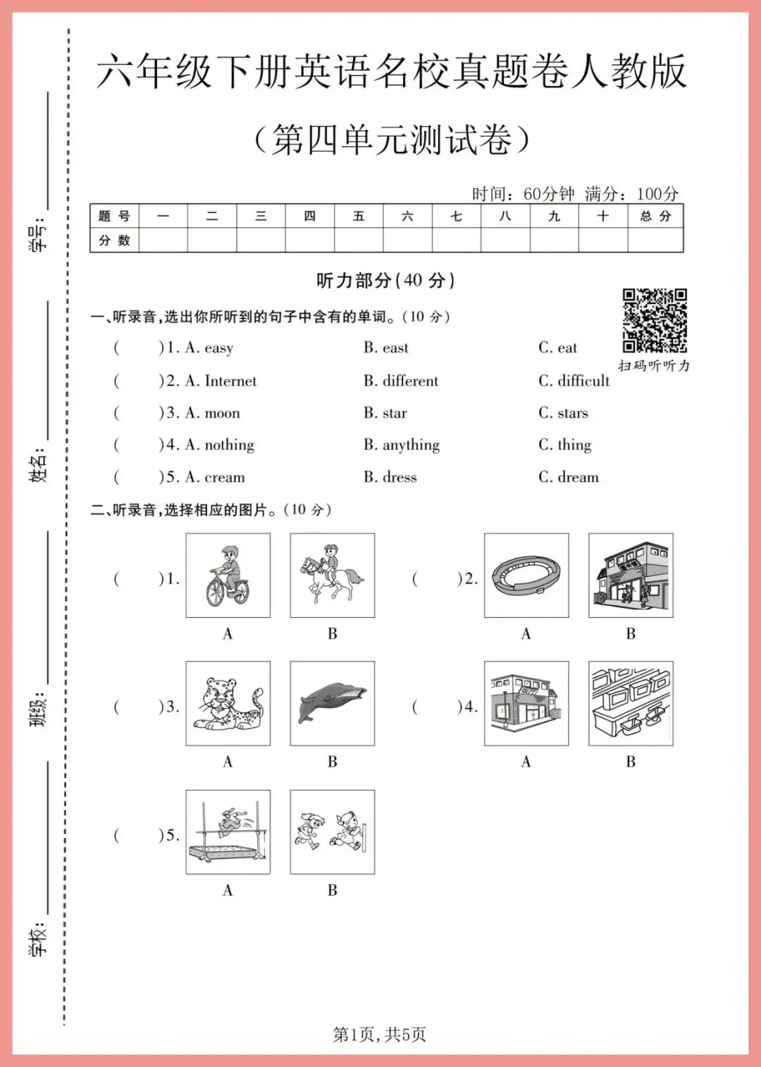 六年级(下)英语_第四单元名校真题卷《人教版》,共5页,电子版可打印可下载。这份资料内容丰富,结构清晰,包含了核心知识点和练习题,帮助孩子巩固学习成果,及时发现不足之处,查缺补漏。有需要的家长抓紧打印出来给孩子练一练吧!