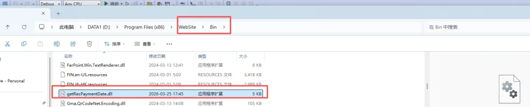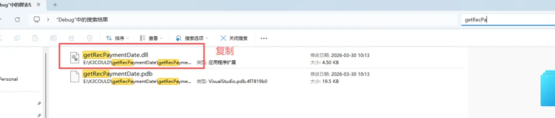 2、复制路径并打开找到getRecPaymentDate.dll文件,Ctrl+C复制一下