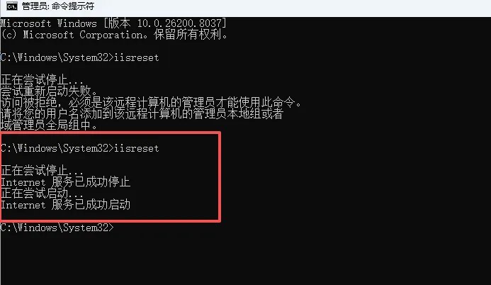 4.重启iis,以管理员打开CRM命令dos窗口,输入iisreset命令,看到启动成功,代表OK了。如图:
