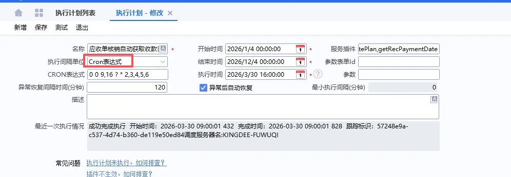 5.打开金蝶,搜索执行计划并打开,新增执行计划,因为已经新增了,我就不再展示新增步骤,这个很简单,重点强调关键问题。如下图: