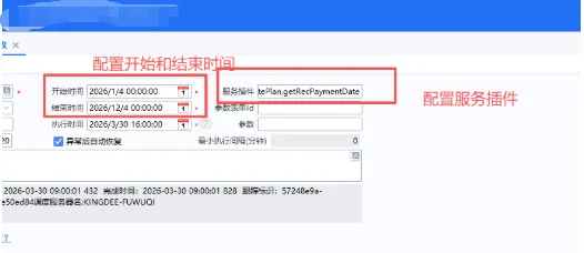 配置开始结束时间和配置服务插件,服务插件是重点,必须按照金蝶的规则,否则无法执行,规则是: