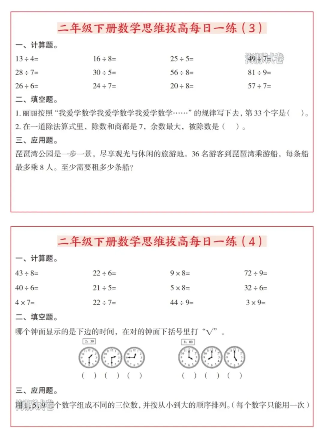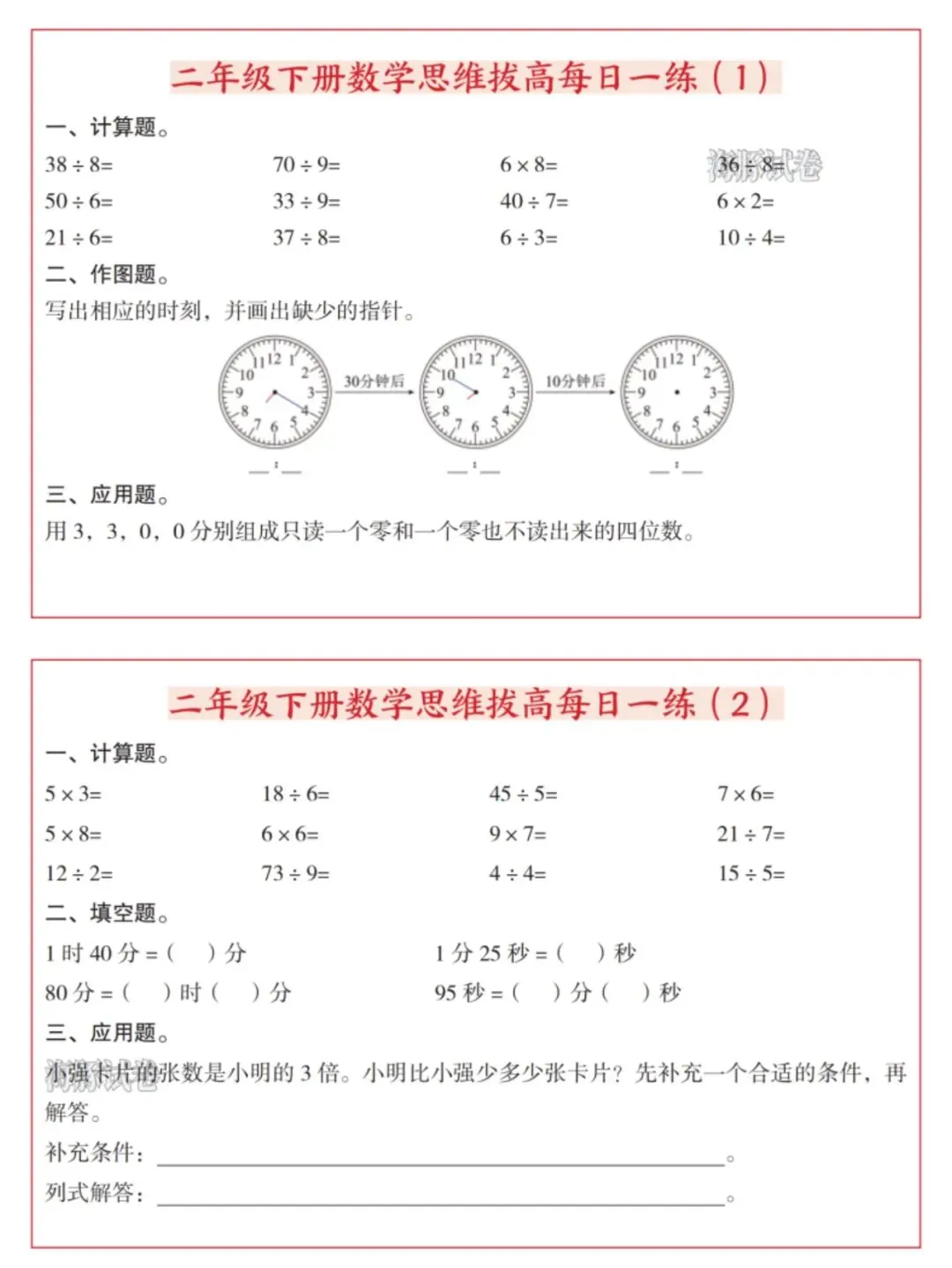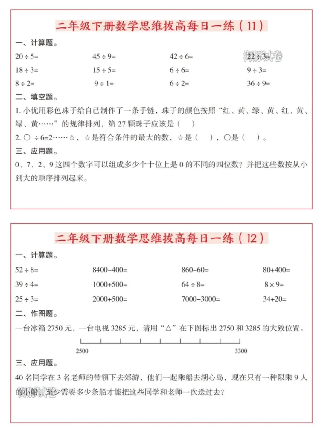 今天给大家分享:二年级下册数学思维拔高每日一练,一共10页。