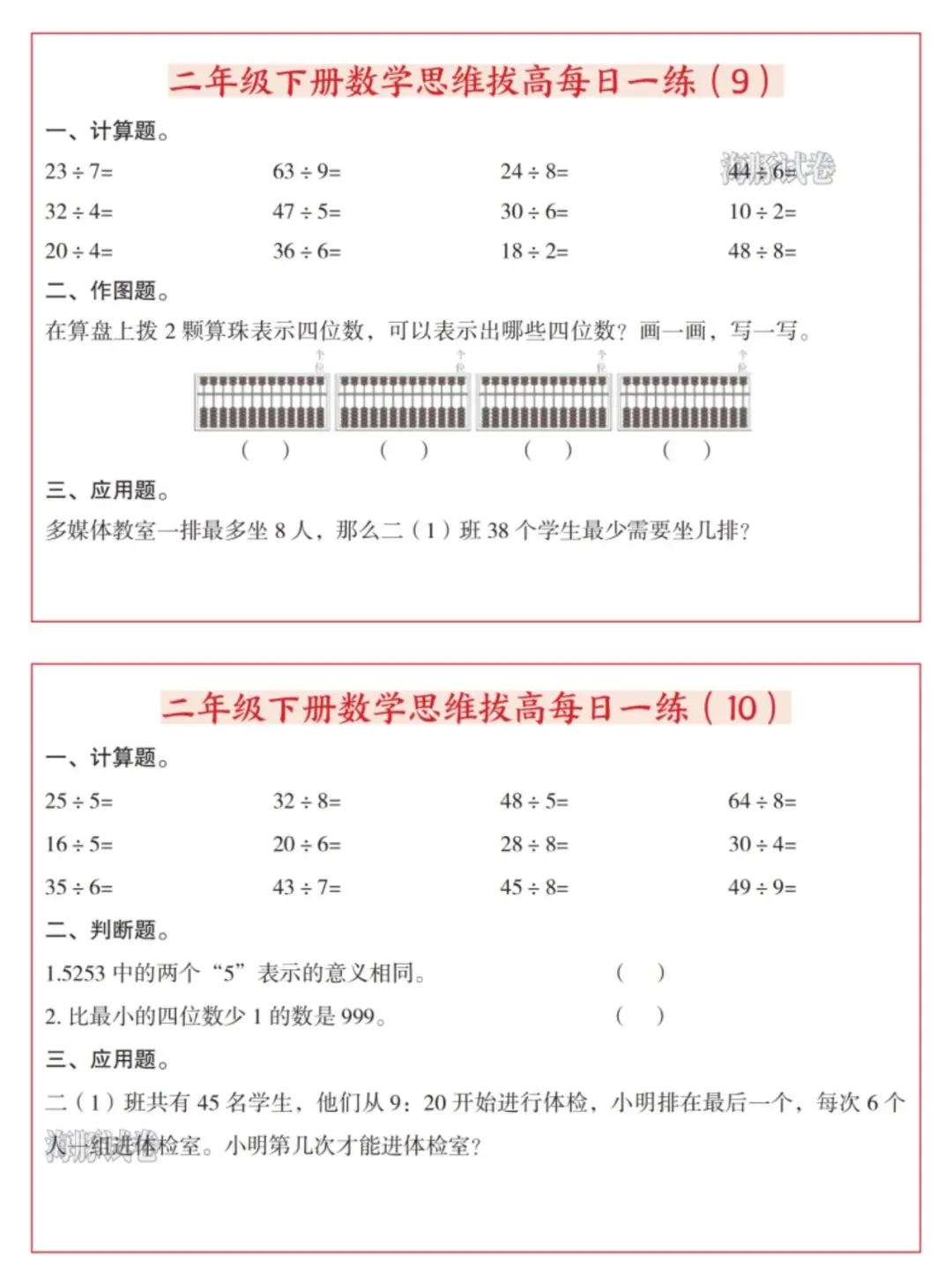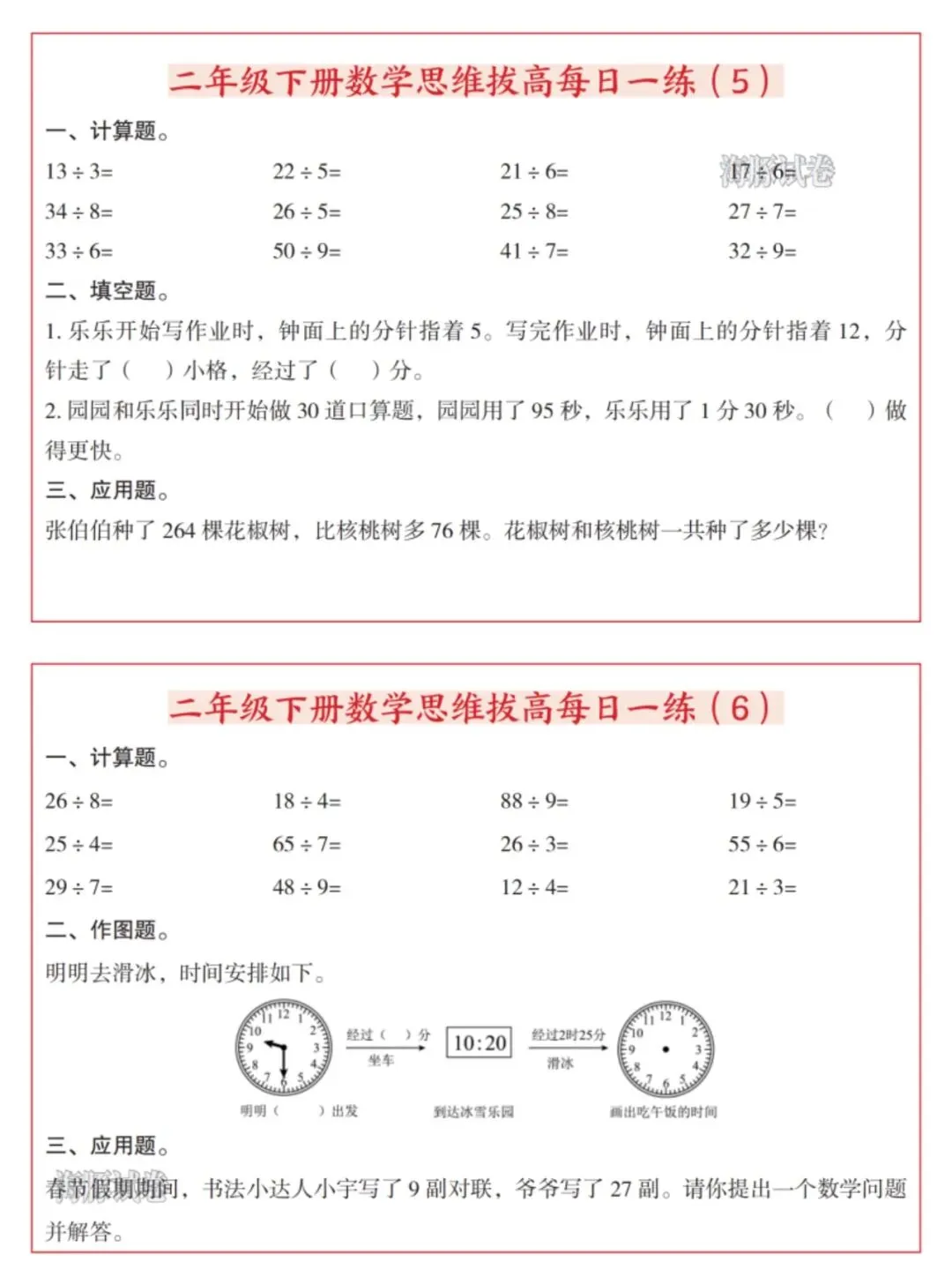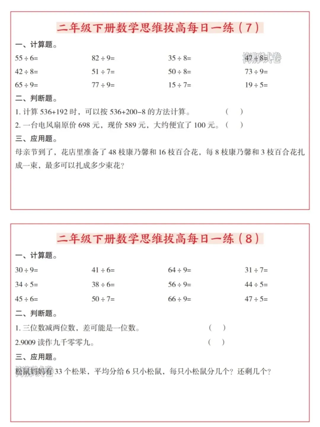 今天给大家分享:二年级下册数学思维拔高每日一练,一共10页。