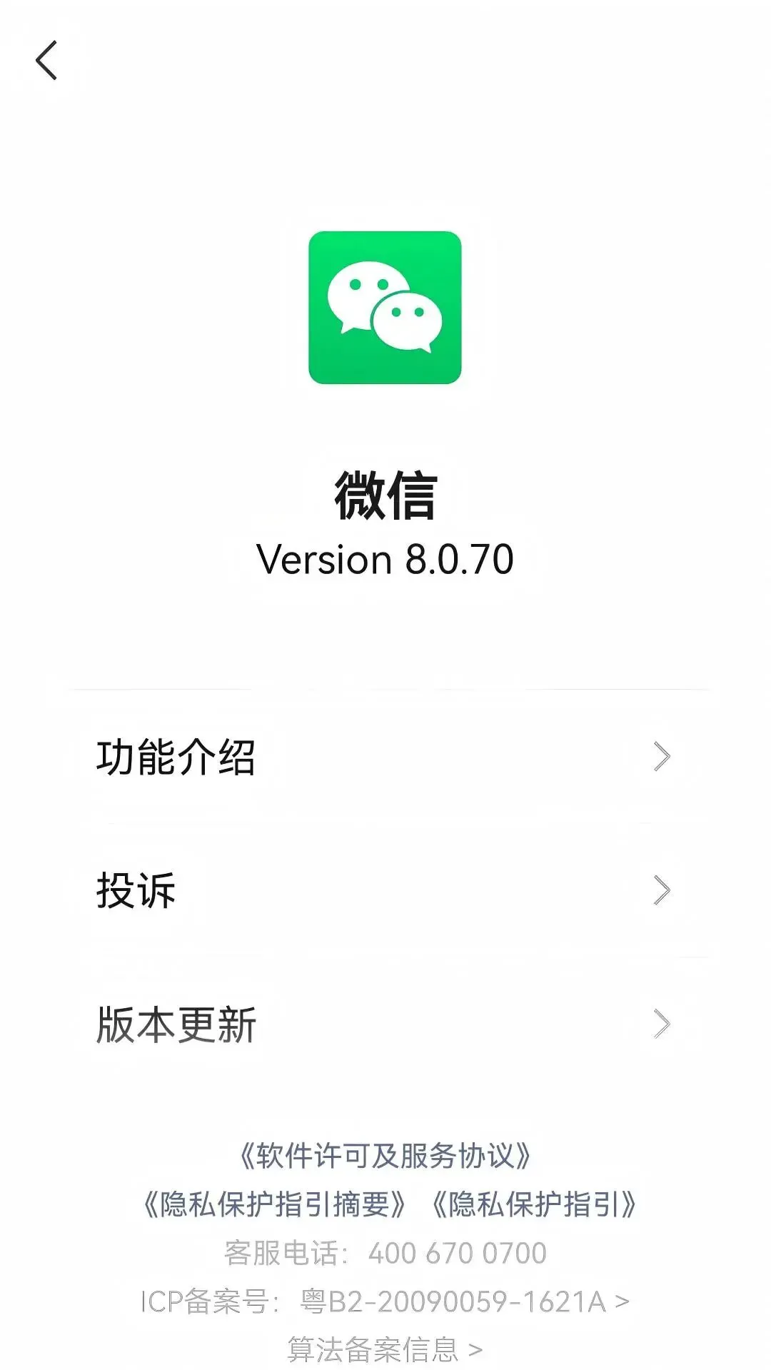 测试版本号为8.0.70_3040 28004610,正式版本号为8.0.70_3040 28004632,大家更新完可以自己点击设置-双击微信图标查看哈。