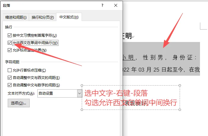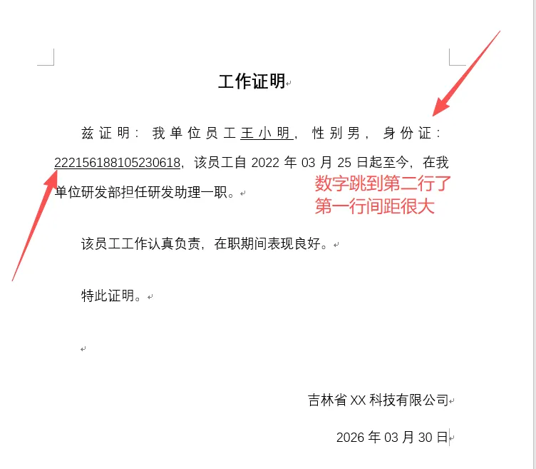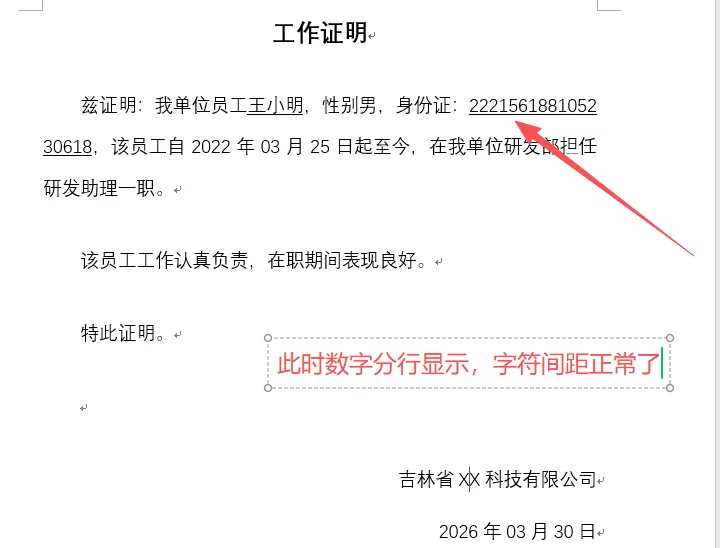 在word中输入身份证号/数字后跳到下一行,上一行的字符间距变宽,这种情况怎么办?