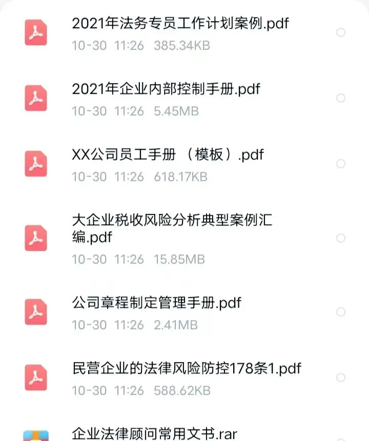 企业风险内控法律汇编礼包,PDF电子版,内容很全,适合法务、法律顾问、企业学习参考。包含企业内部控制手册、员工手册模板、税收风险分析案例、公司章程管理、法律风险防控等,资料整理清晰,查找方便。