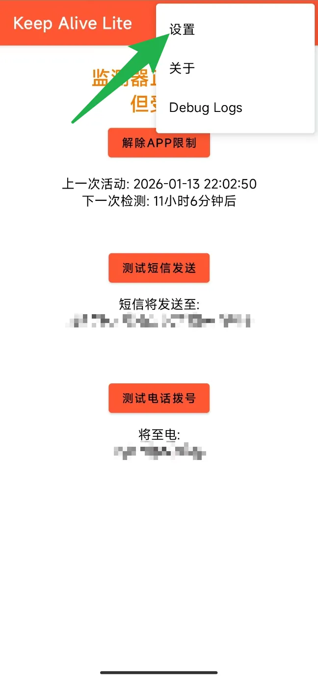 设置需要设置短信和电话,短信的话需要设置短信内容,设置后我们如果在规定的时间内不打开APP,那么软件就会发消息和打电话到指定的号码里。