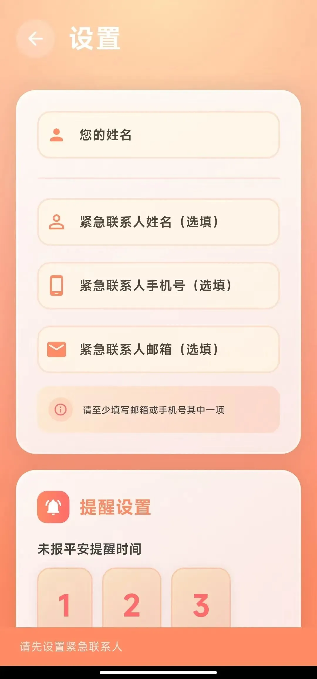 这款软件是需要打卡的,如果超过24小时未报平安,系统会通知你的紧急联系人,发送短信和打电话到你设置的号码中。