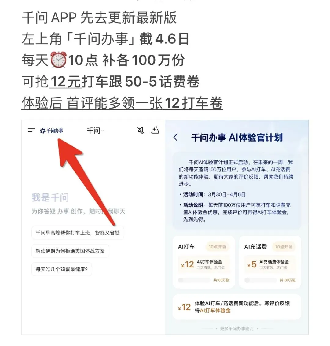橘友们看过来,千问APP又出新活动了 如下图所示,阿里又推出了一个千问AI体验官计划活动,免费领12元打车券和50-5的话费券。 先把千问APP更新到最新版,然后点击左上角的【千问办事】,就可以领取了,活动截止到4月6日,每天早上十点,各补100万份,目前名额非常充足,点进去都能领到。 体验评价后,还可以再领一张12元打车券,不得不说,千问每次放出的福利还是非常大方的。