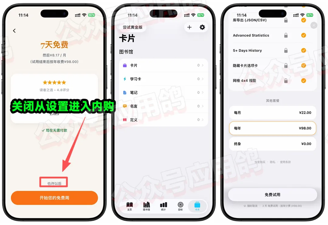支持中文!App Store 阅读神器永久订阅 最近热门: 屏蔽 iPhone 应用开屏广告,新方法有效 成功!速收 iOS 苹果稀缺神器 大家好!分享一款专为中文阅读场景设计的阅读记录工具,目前可以免费获取它的终身阅读,打开软件完成初始化弹出内购,点击也许以后从设置进入,底部终身显示0即可免费获取。 读书记录 一款强大的阅读记录和书籍管理神器,可以整理个人书库、记录阅读进度,根据阅读习惯,设置周期书单管理,按想读、在读、已读、弃读四状态分类书籍,支持自定义书架与标签,适配纸质书、电子书、有声书多场景。 软件支持OCR 文字识别快速摘录书摘,可插入照片补充笔记,支持微信读书 / Kindle 笔记导入,支持导出 TXT/PDF支持。 获取方式 软件不是看书神器(需要小说可以看这里:500+ 添加成功 ,速收 App Store 稀缺神器),他是个专业的阅读管理工具,感兴趣的朋友不要错过了!安装它需要iOS15.6及以上。