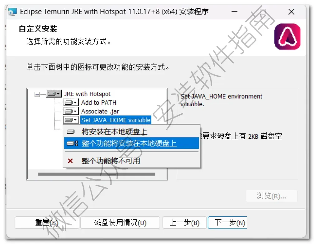 5、点“Set JAVA……”前的红色【x】选择【整个功能将安装在本地硬盘上】。