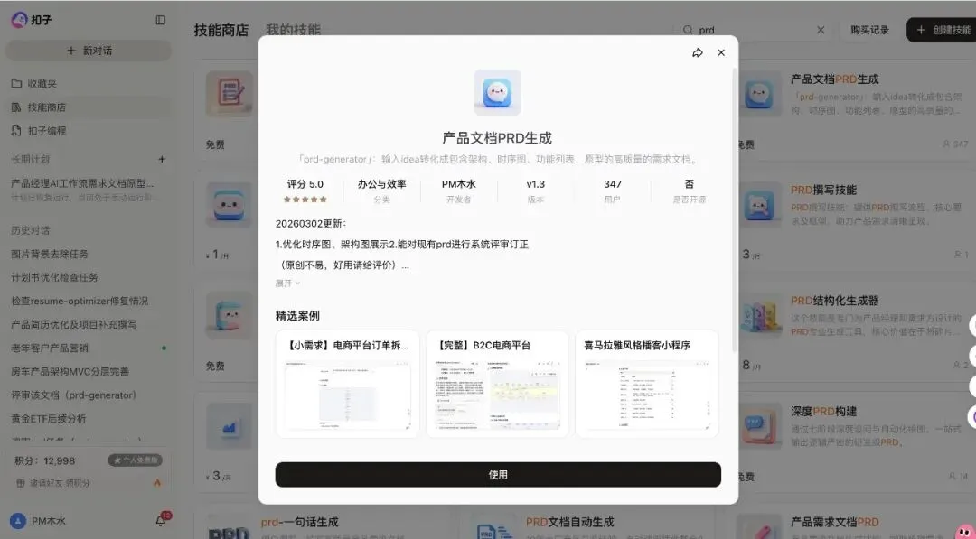 2. 点击技能商店,搜索「产品文档PRD生成」,我已经共享给大家,可以直接使用,你也可以根据自己需要搭建: