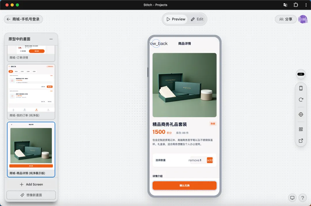 第二步:PRD粘贴到Stitch,AI生成高保真原型