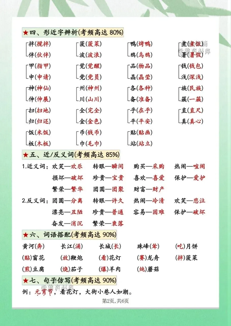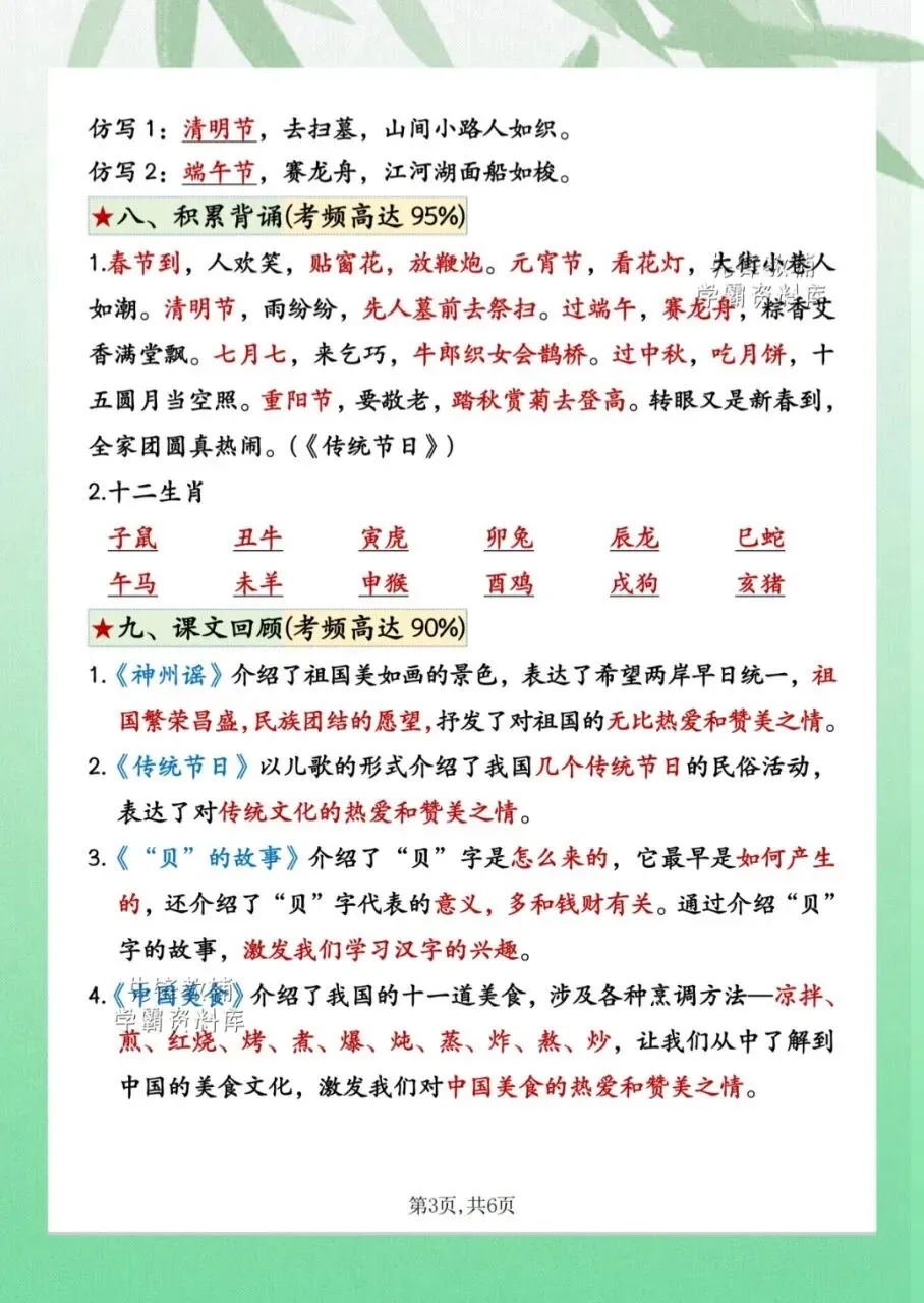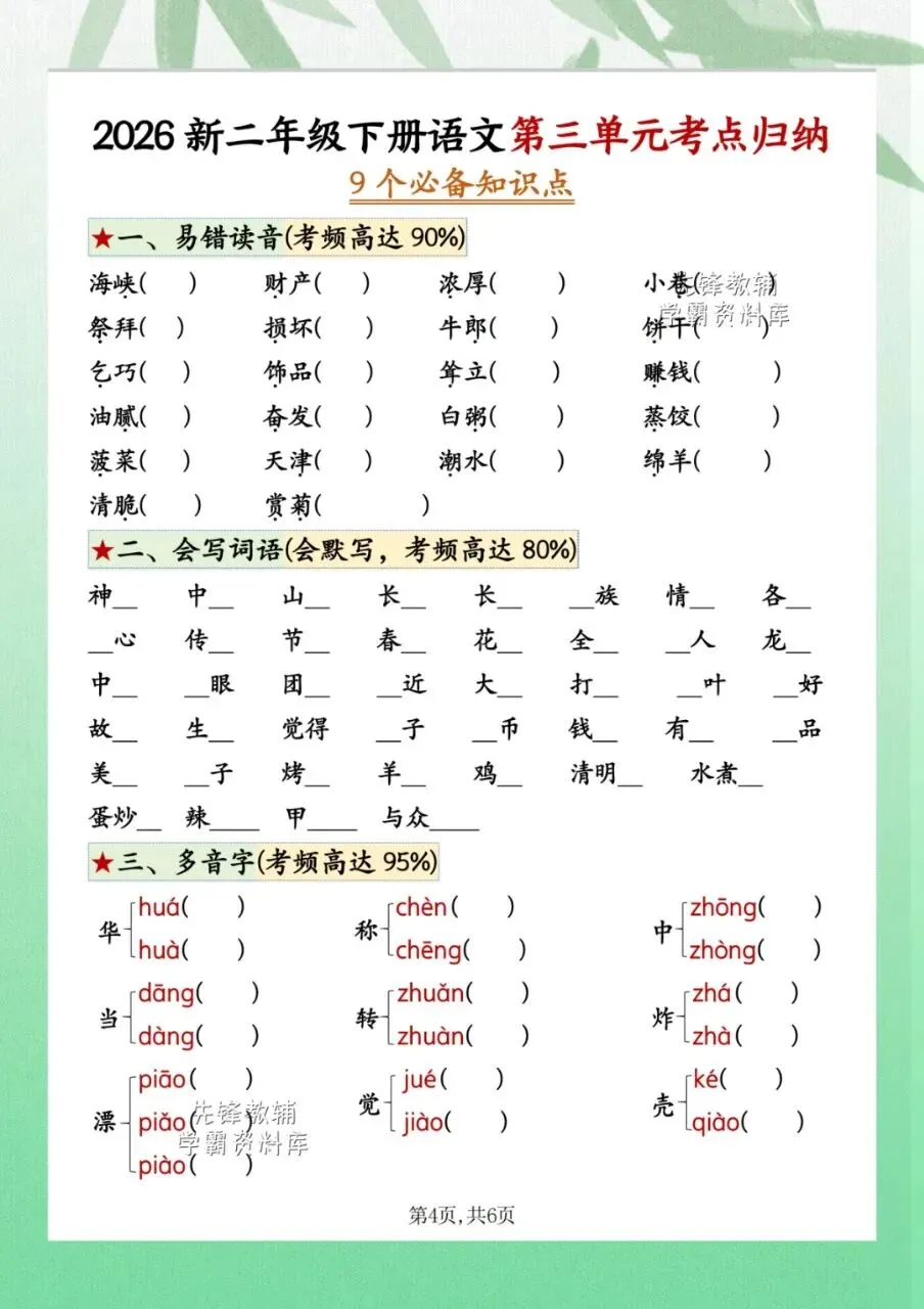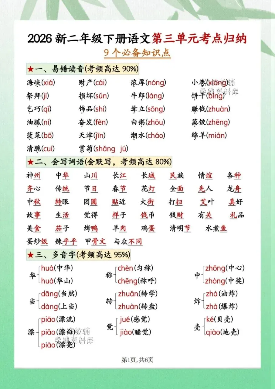 今日分享2026二年级下册语文第三单元考点归纳9个必备知识点共计 6 页。第三单元考点归纳包含了易错读音、会写词语、多音字等内容。需要的家长抓紧打印出来,让孩子在利用课余学一学、背一背,扎实基础。