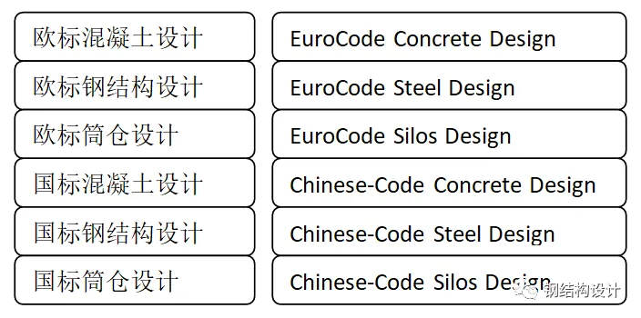 其中,欧标模块包括混凝土及基础设计模块ECConCrete、钢结构设计模块ECSTeel和筒仓设计模块ECSilos;美标模块待开发;国标模块包括砼及基础设计模块GBConCrete、钢结构设计模块GBSTeel和筒仓设计模块GBSilos。