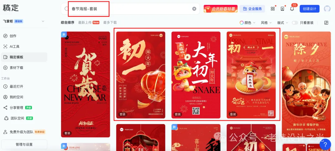 因此我直接搜索:春节海报-套装,然后稿定设计已经帮我筛选出比较符合的几套模板了,如红框所示“