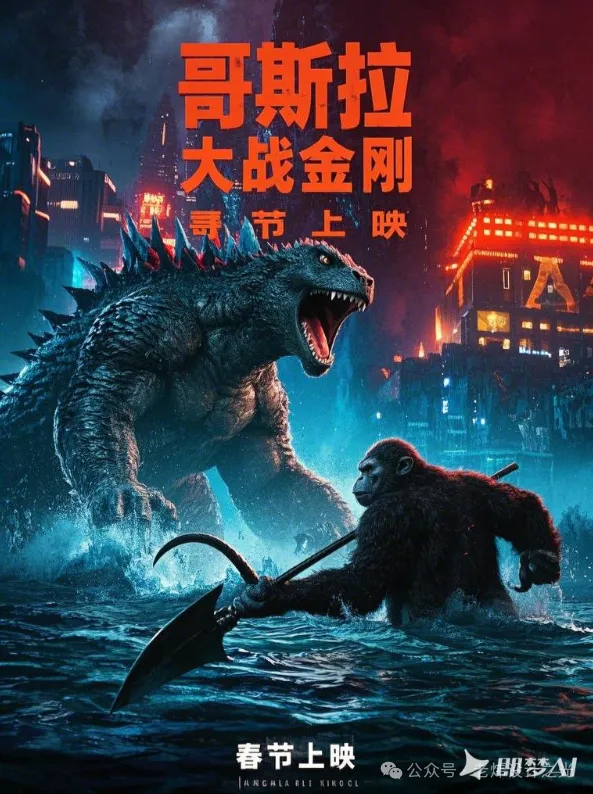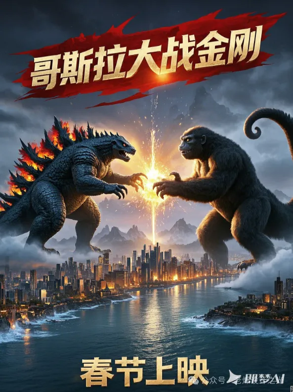 比如我输入:一张电影海报,画面中心是一头凶猛的哥斯拉巨怪浮出海平面,和一头巨大的金刚猿猴在打斗,标题为“哥斯拉大战金刚”,标题下方文字写着“春节上映”,8K画质