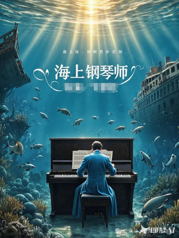比如我输入:电影海报,艺术摄影,超现实主义,海底世界,在海底下钢琴师背向画面正在弹奏,温暖的阳光折射在他的身上,背景是沉没破旧的邮轮,海底下有残骸,凄美的画面氛围,HD,高清,获奖摄影作品。海报上方写有:“海上钢琴师”搭配“ 导演:老炜设计之光”,具有排版美感,设计感。