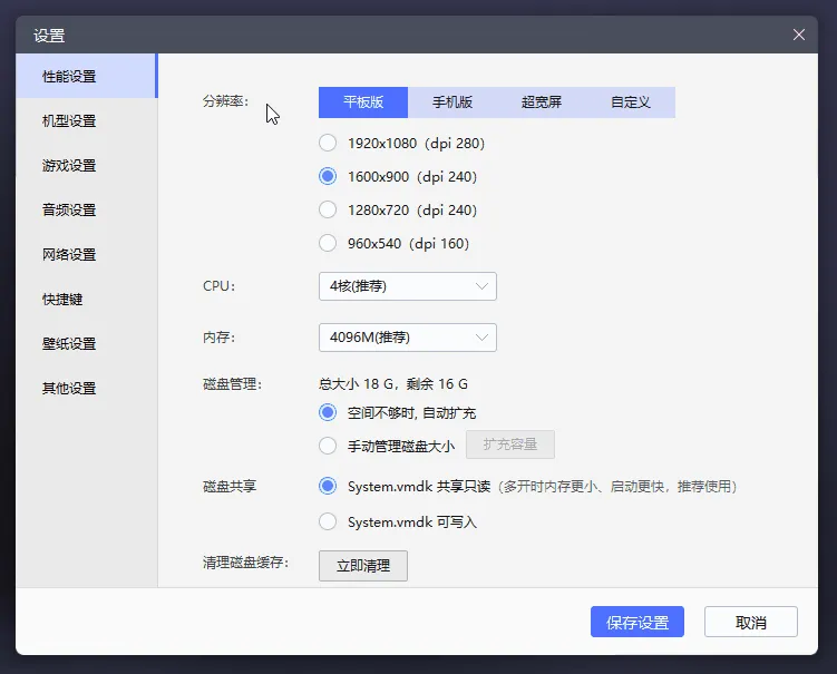 与大多数模拟器一样,该有的功能一个不落,性能、机型、游戏、音频、网络、快捷键、root权限、ADB调试等都可自定义。