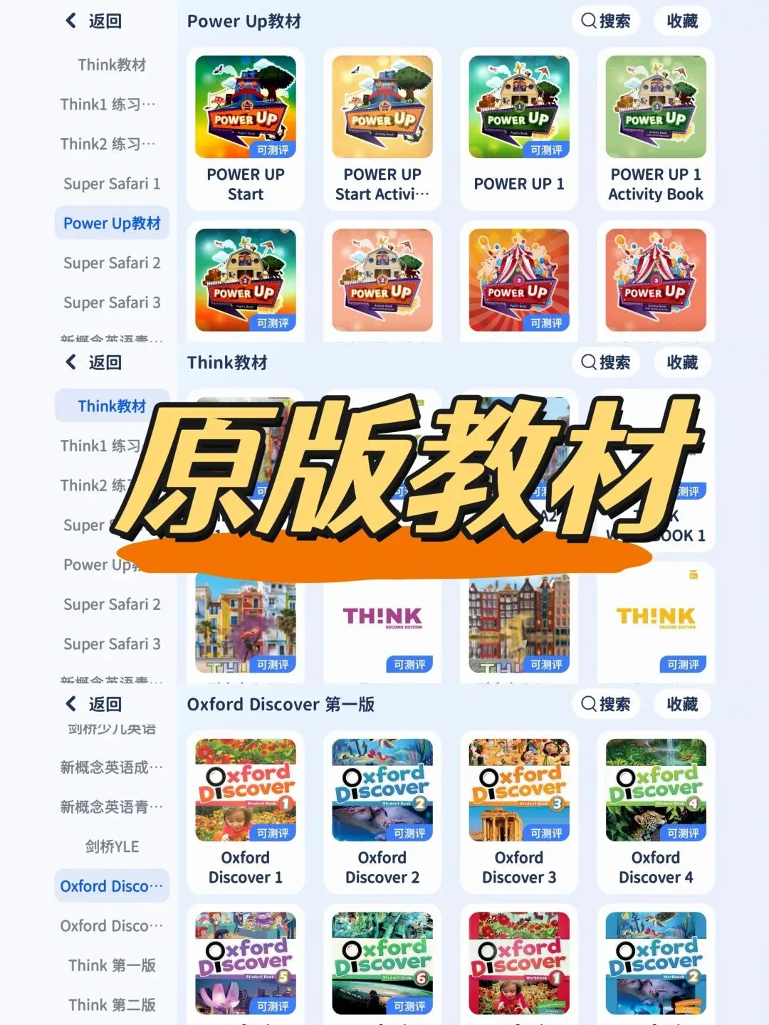 剑桥系 :Super Safari, Kid’s Box, Power Up, Think, Unlock, Prepare, Compact, Complete