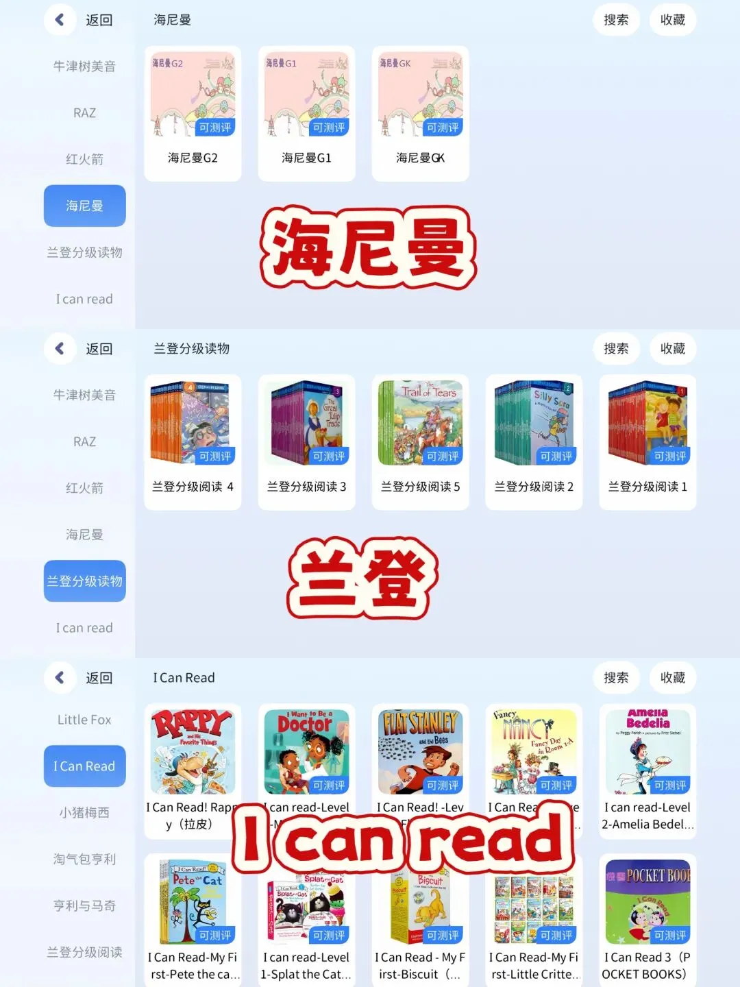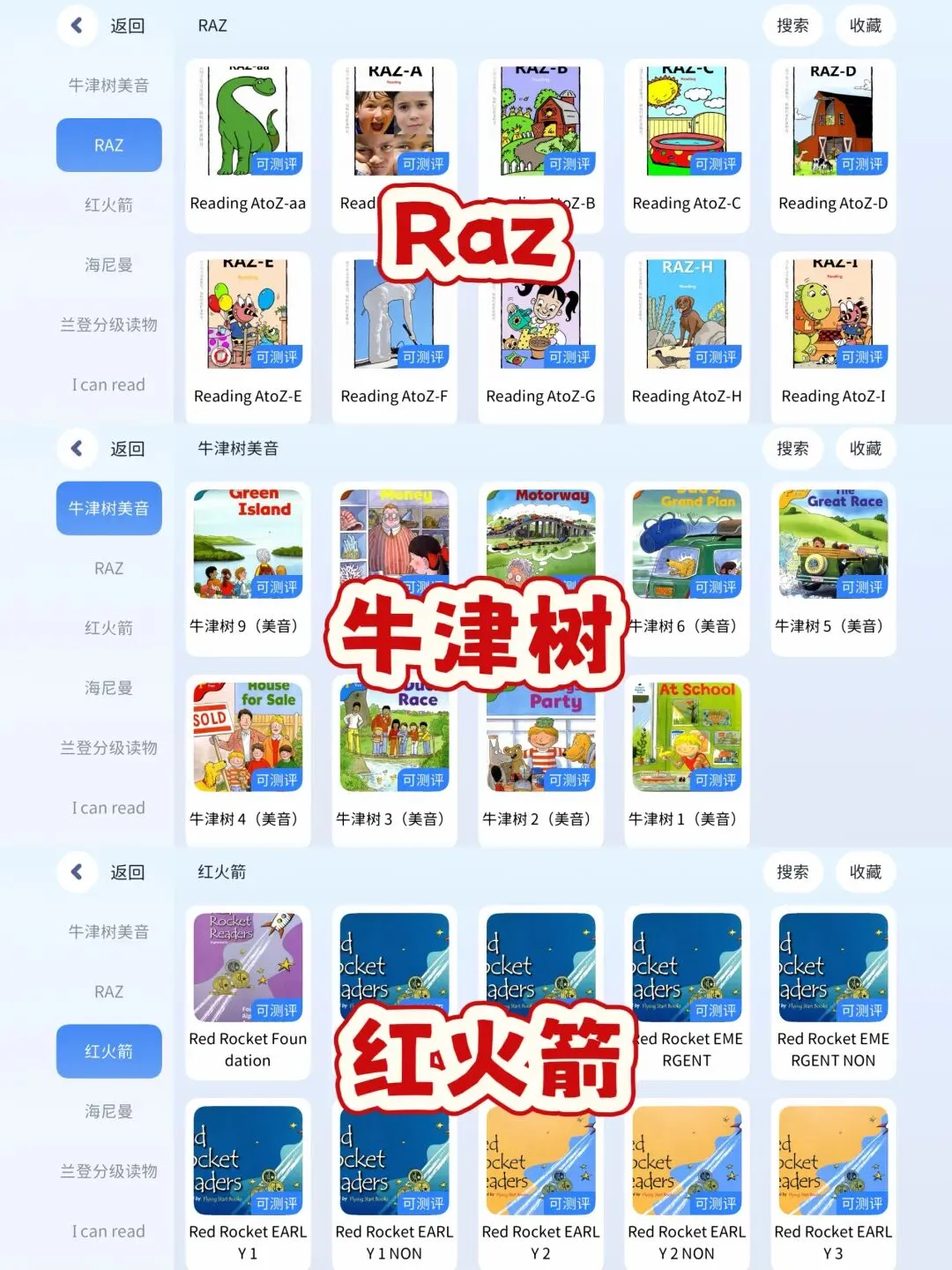 分级 :RAZ(全套)、牛津树、红火箭、海尼曼、培生、典范英语……