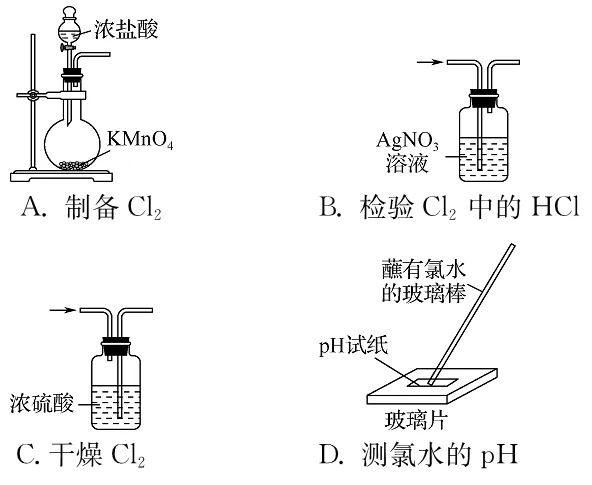 【解析】 常温下浓盐酸和高锰酸钾发生反应生成氯气,A正确;氯气和氯化氢通入硝酸银溶液中均有白色沉淀产生,无法检验Cl2中的HCl,B错误;干燥氯气时,通入Cl2的导管应“长进短出”,C错误;氯水有漂白性,不能用pH试纸测氯水的pH,D错误。