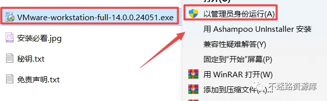 2.打开刚刚解压的文件夹,鼠标右键点击“VMware-workstation-full-14.0.0.24051.exe”选择“以管理员身份运行”