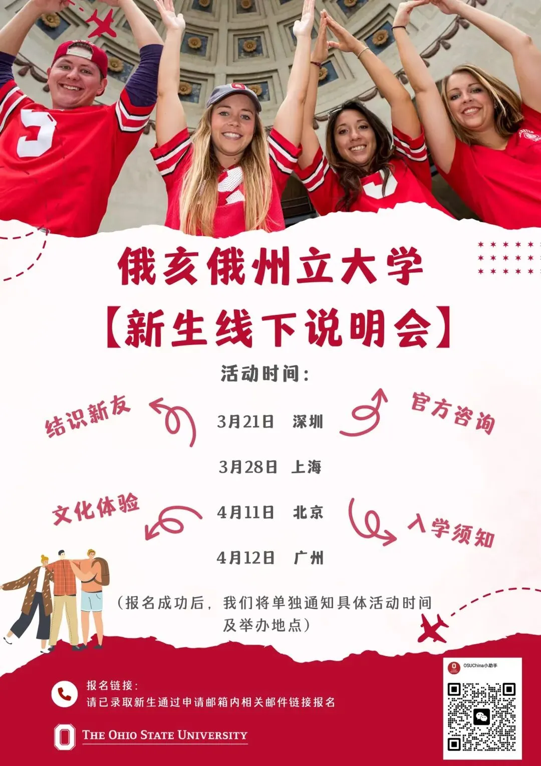 4月,我们将在北京和广州举办已录取新生线下说明会,分享关于俄亥俄州立大学丰富多彩的校园生活、体验、机会以及下一步的入学信息。同时,你将有机会向工作人员提问并获得专业解答。